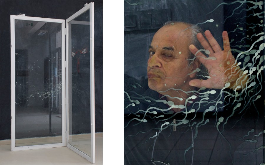 Heymimres-5 (‘Büyük Cam’a Saygı), 2017, cam, alüminyum, demir, boya, vernik, siyah mekânda, (sağda, sanatçı işin arkasında) 213x95x95 cm Heymimres-5 (After ‘Large Glass’), glass, aluminum, iron, oil, varnish; in the dark backround (at right, the artist behind the work)