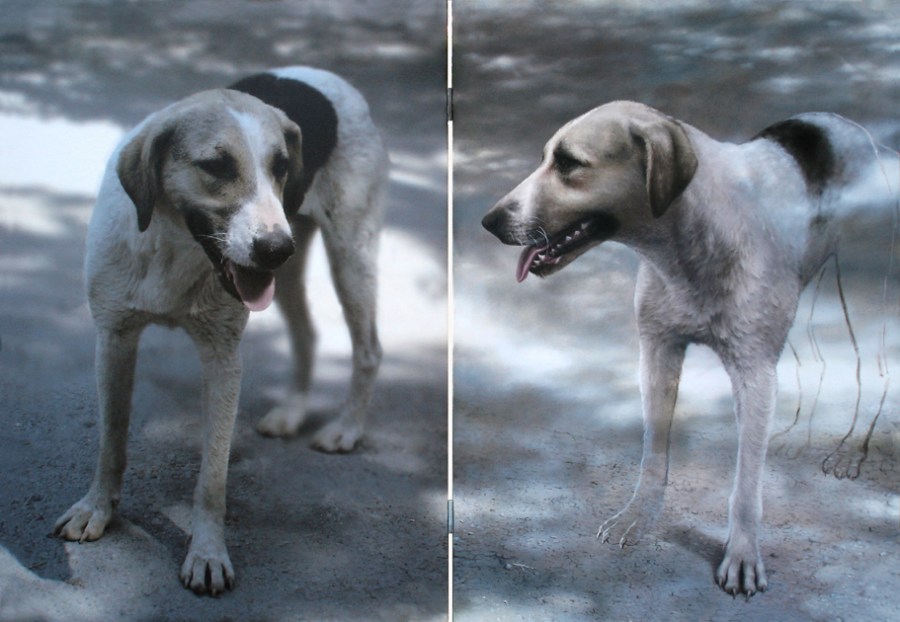 Köpek ve kepöK, 2013, sol, tuvale dijital baskı; sağ, tuvale yağlıboya, 95×137 cm / Dog & goD, left, digital print on canvas; right, oil on canvas