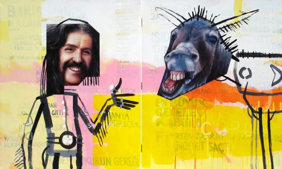 Arkadaşın Çapulcu Oldu, 2014, sol, tuvale akrilik; sağ, tuvale akrilik ve dijital kesyap, 120×197 cm
