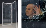 - Heymimres-5 (‘Büyük Cam’a Saygı), 2017, cam, alüminyum, demir, boya, vernik, siyah mekânda, (sağda, sanatçı işin arkasında) 213x95x95 cm / Heymimres-5 (After ‘Large Glass’), glass, aluminum, iron, oil, varnish; in the dark backround (at right, the artist behind the work)