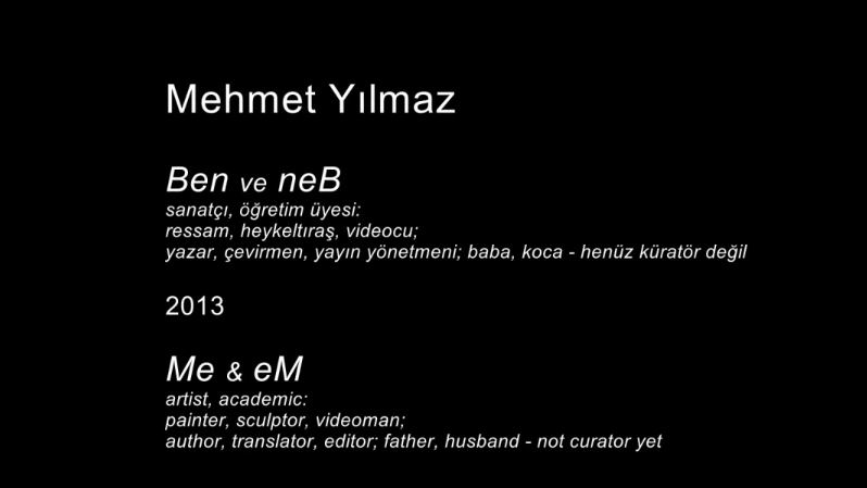 Mehmet Yılmaz’a dönecek olursak; birikimi, kuramsal ve uygulama alanlarındaki üretkenliği ve kendini sürekli yenilemesi, en önemli özelliği olarak göze çarpmaktadır. Yılmaz, sınırlar içerisinde dolaşmayı sevmeyen bir kural yıkıcı; tam bir eylem ve sentez insanıdır. Aynı ifade biçimi ya da meseleler üzerinde uzun üretimler yapmak yerine, malzemelerini ve problemini sürekli güncellemesi sanatta sık görmeye alışık olduğumuz bir durum değildir. Kimi sanatçılar -Yılmaz’ın kendi ifadesiyle- daha dar bir alanda, daha derin bir araştırmaya yönelirken, Mehmet Yılmaz sanatının alanını sürekli genişletmektedir. Ben ve neB de, kompozisyonun sağ tarafındaki sanatçı karakteri olarak, belirli aralıklarla belli hareketleri tekrarlar. Bir süre tekrarladığı hareketini, sonra bir anda değiştirip farklı bir şey yapmaya başlar ve bu döngü videonun sonuna kadar devam eder. Sanatında da belirli aralıklarla belli teknikleri, içerikleri tekrarladığını sonrasında bambaşka bir seri ile yeni bir problem yarattığını görürüz. Videonun montajında tesadüfen ortaya çıktığını söylediği bu zaman kırılması durumu, belki de farklı sanat ivmeleri arasındaki sıçrayışlarının ve sürprizleri sevmesinin bir yansımasıdır.