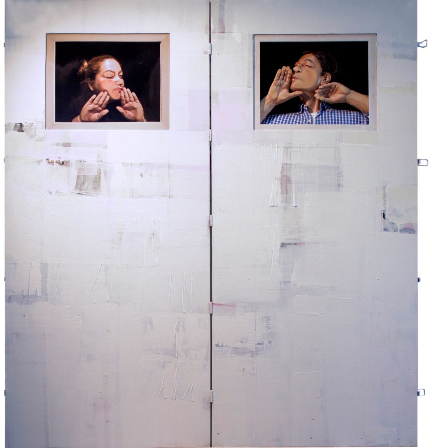 Heymimres-3 (Bir Lezbiyen ve Bir Homoseksüel), 2016, mdf, ağaç, pişmiş toprak, alçı, boya, fotoğraf, kumaş, peruk; önden görünüş, 200x181x30 cm / Heymimres-3 (A Lazbian & A Homosexual); mdf, wood, terracotta, plaster, paint, photograph, toupee; view from front side