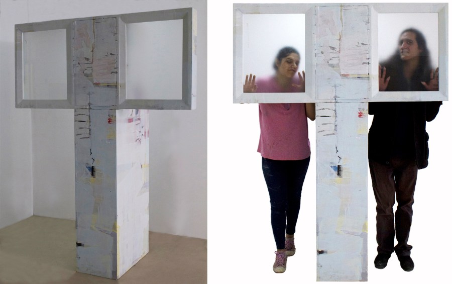Heymimres-4 (Küçük Cam), 2017, ağaç, sunta, cam, sunta, akrilik boya, kağıt (sağda, iki izleyici ile), 200x150x66 cm / Heymimres-4 (Small Glass), wood, hardboard, glass, acrylic, paper, (with two spactators)